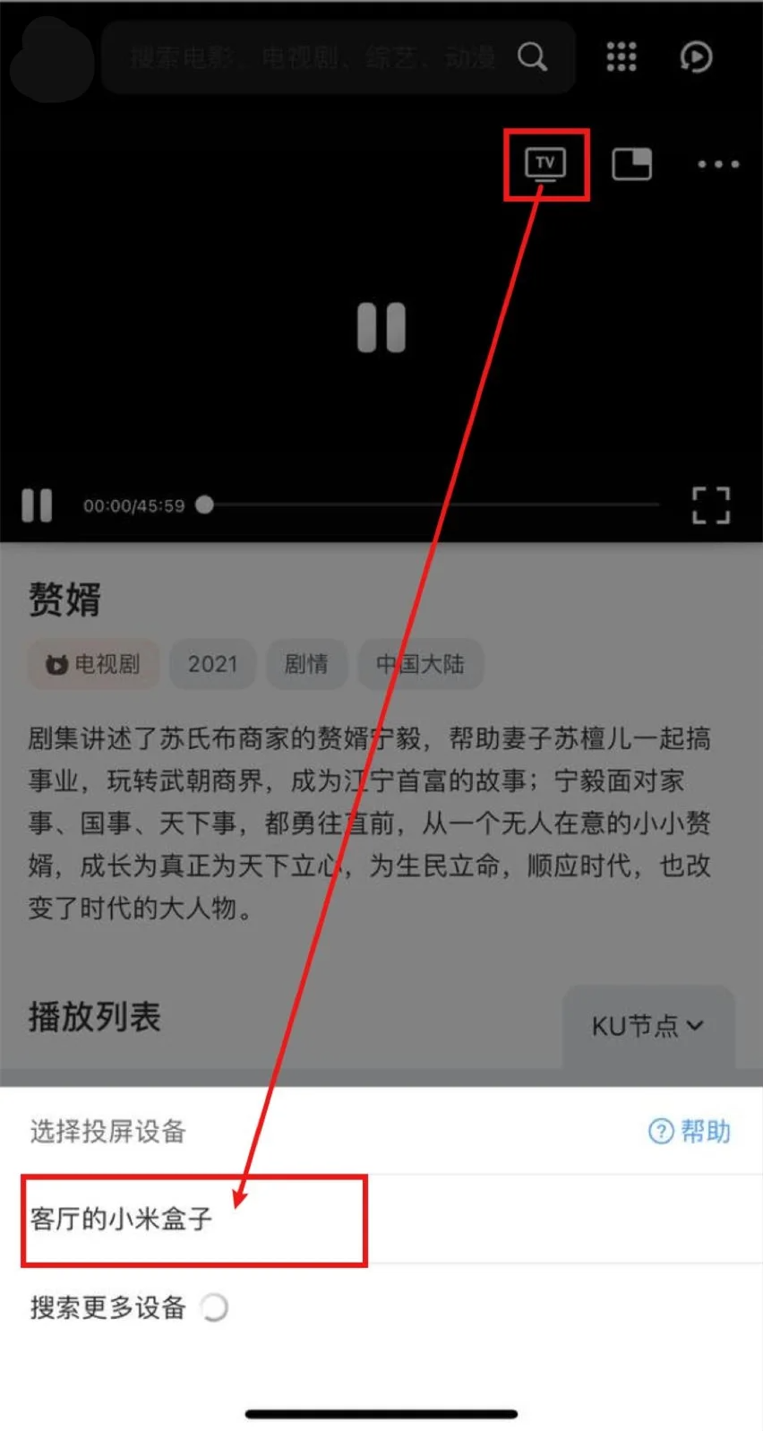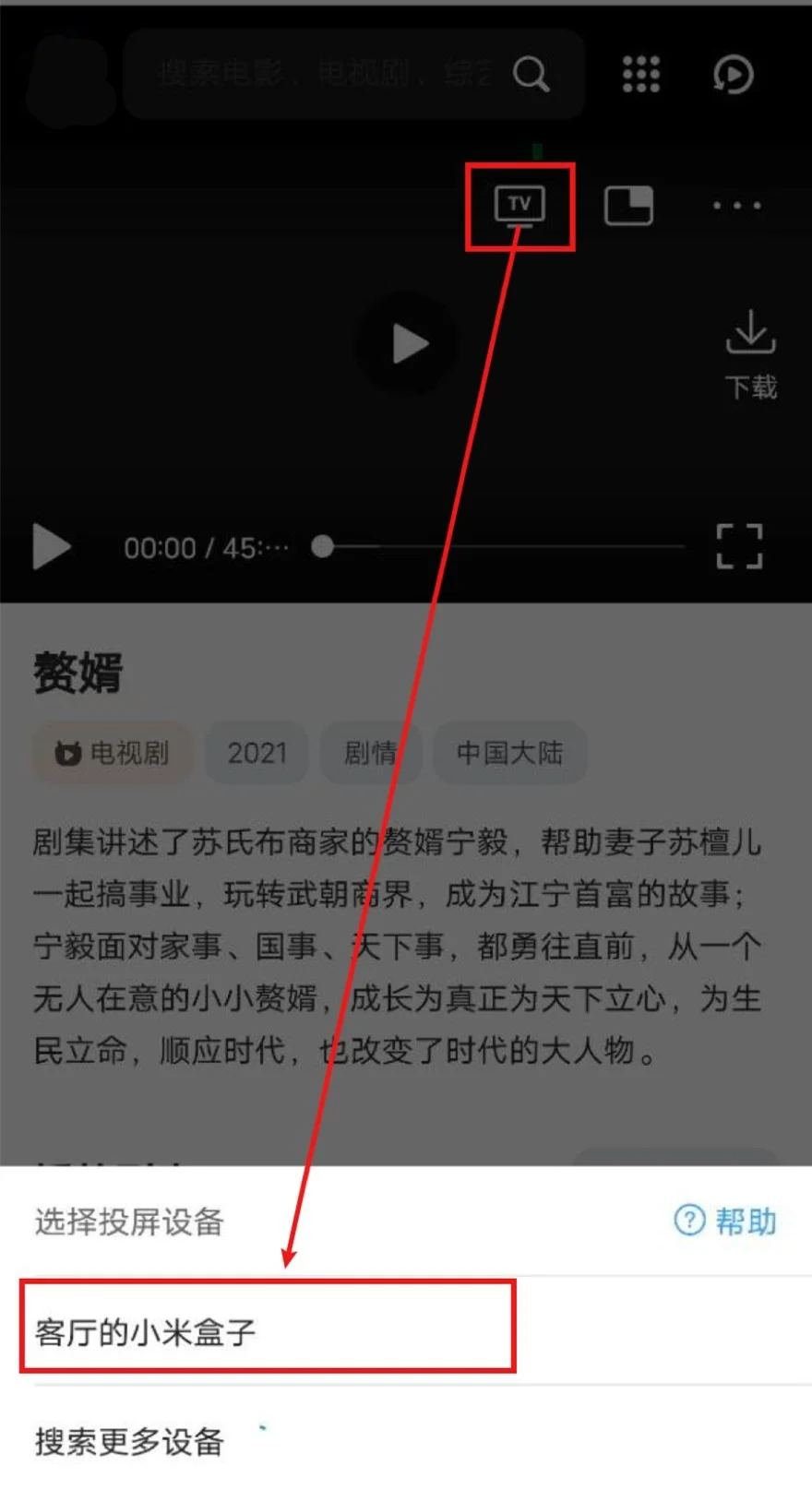 打开QQ浏览器(会接管网页播放器)->打开福利社->播放视频->选中投屏图标->等待搜寻出智能电视/电视盒子->选中,即可投屏。